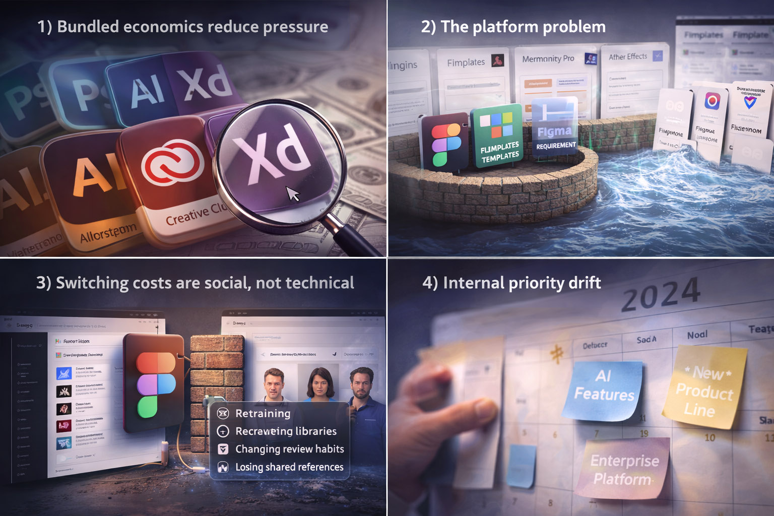 Adobe XD often feels unfinished despite being a capable tool — from collaboration architecture and ecosystem economics to Adobe’s shifting priorities in a Figma-dominated market.