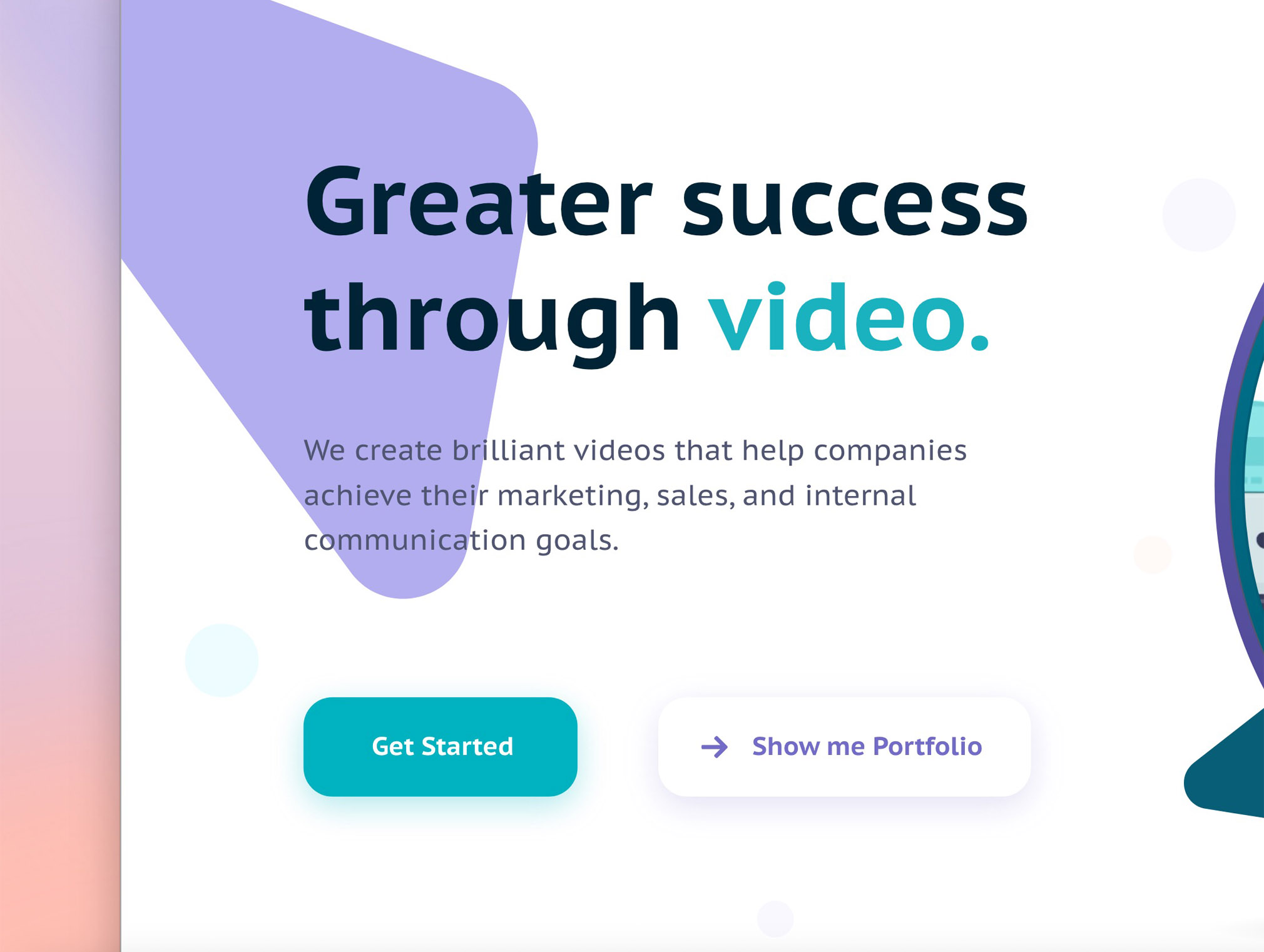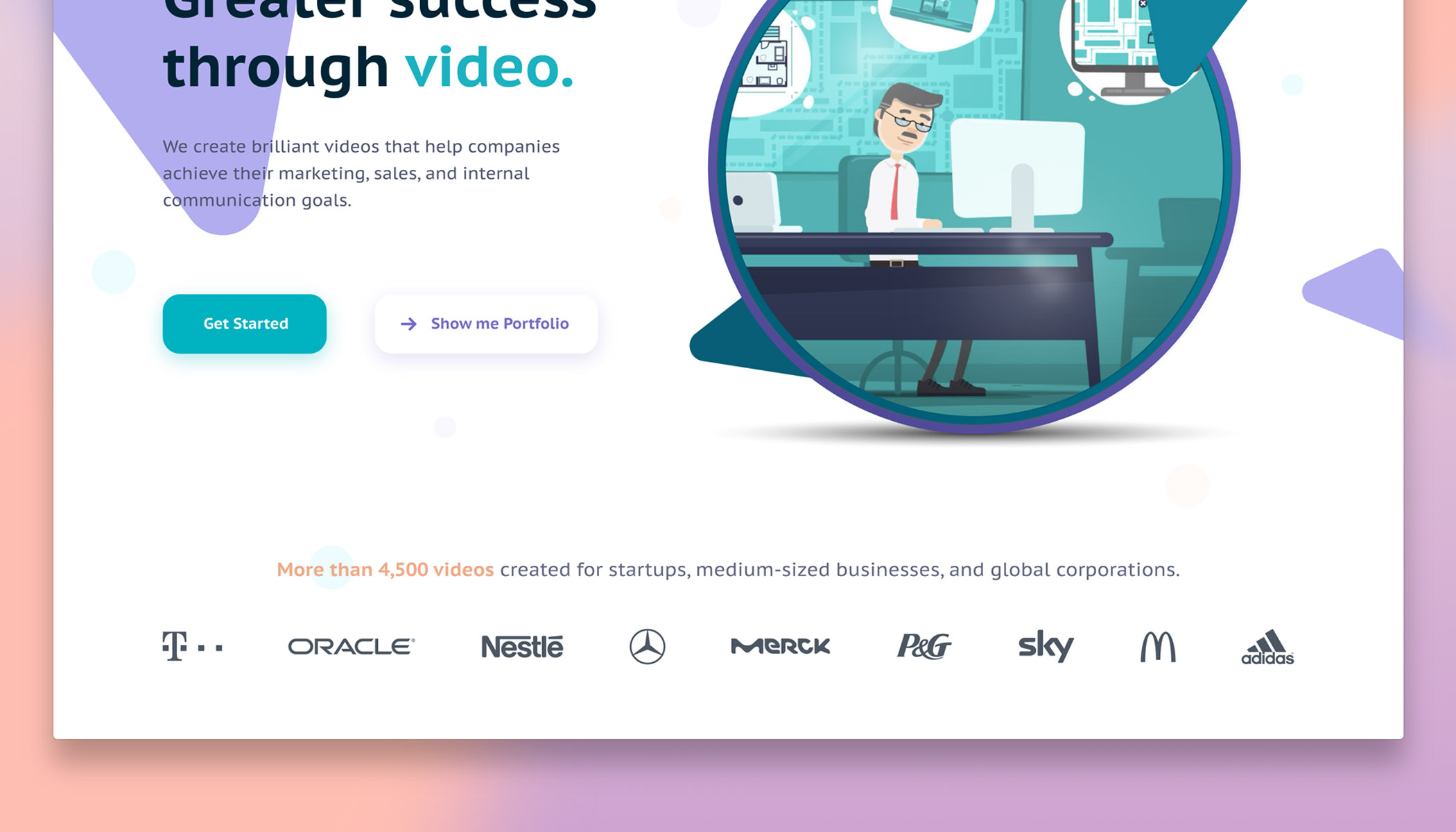 The final landing page design delivers a fresh and modern look with clean typography and bright highlights. A hero illustration emphasizes the creative and animated nature of the client’s video production. Clear CTAs guide the user to get started or explore the portfolio, while the use of gradient backgrounds and brand-consistent green tones create a contemporary, professional impression. Partner logos at the bottom reinforce trust and credibility.