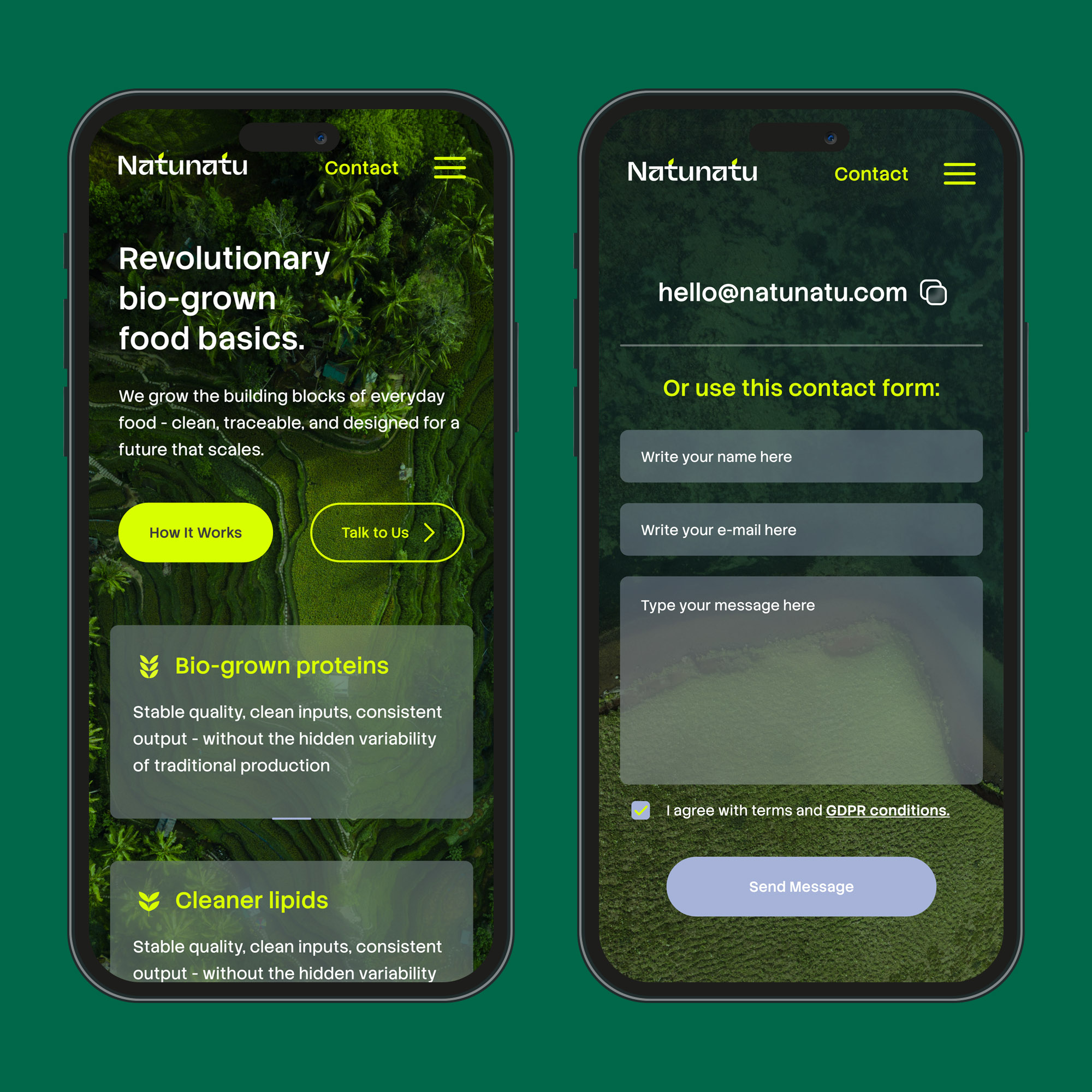 Brand identity and mobile-first website design for Natunatu β a fresh, bio-driven concept built on loud green energy and natural textures.