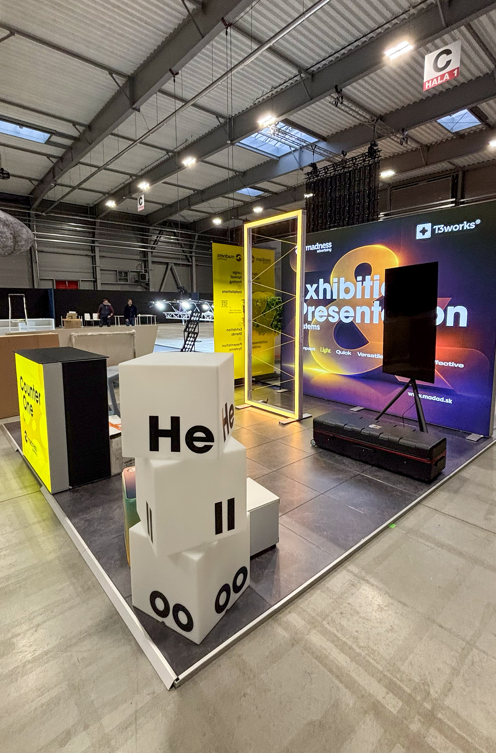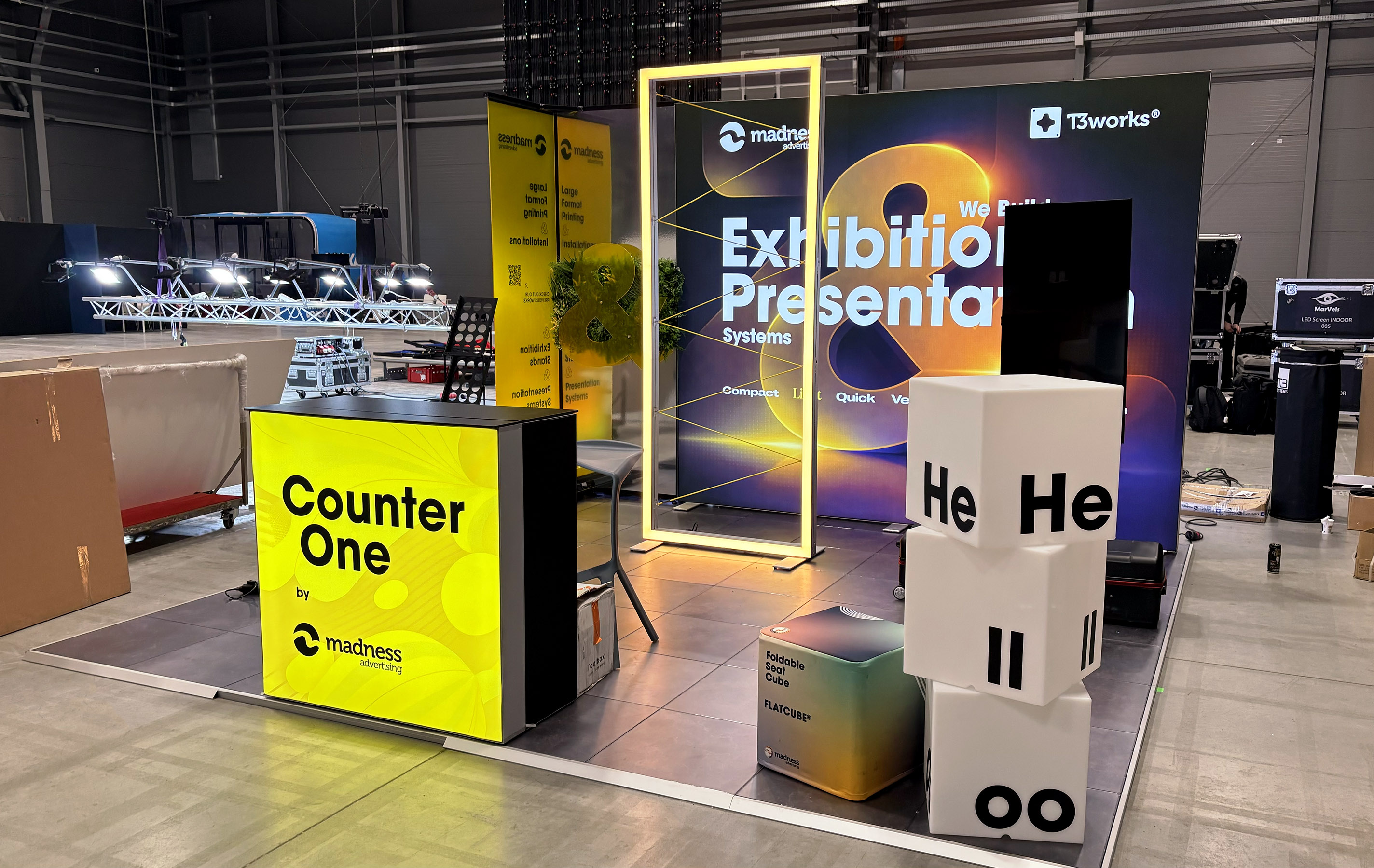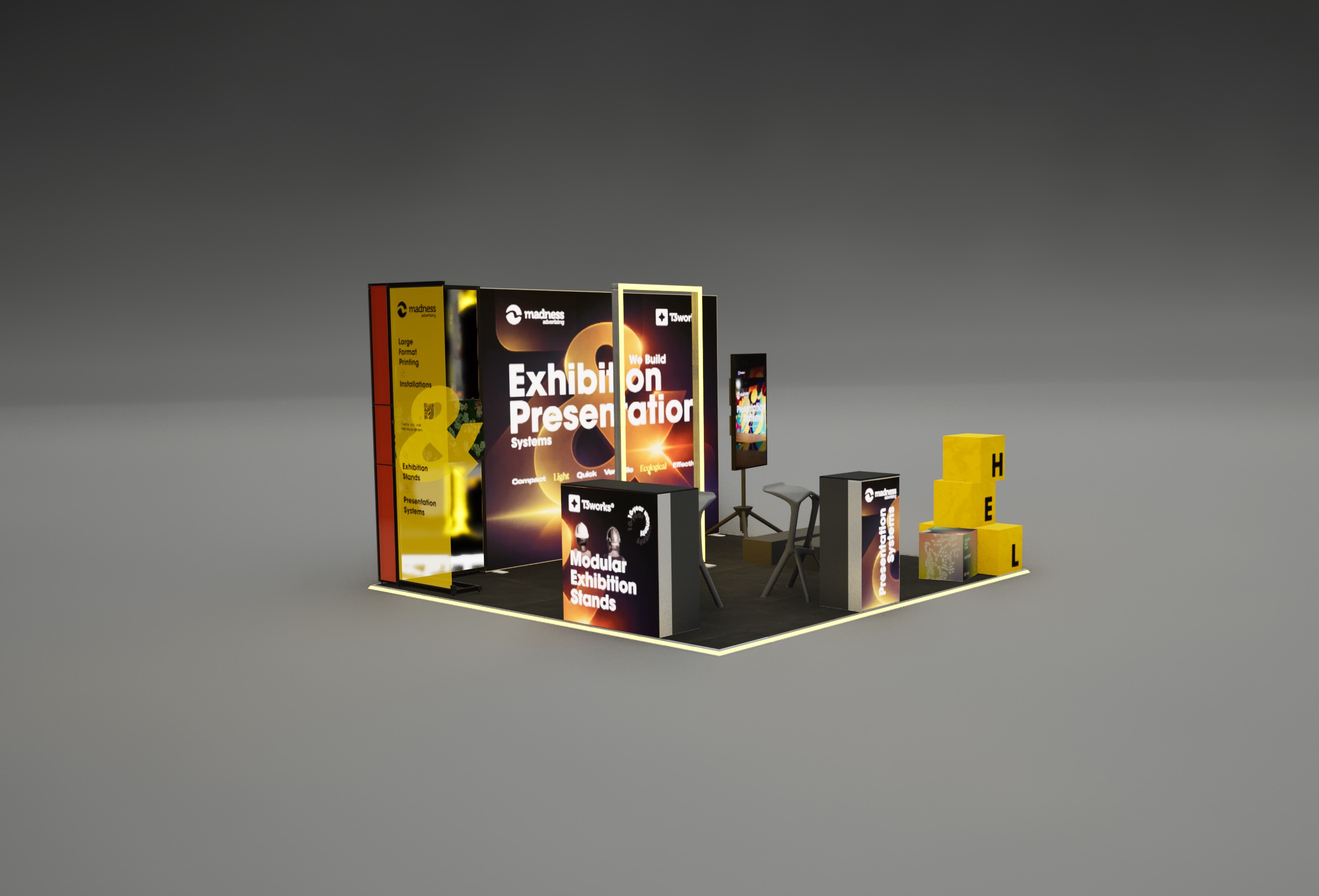 Madness Advertising received a non-typical 4x4 m exhibition space opened from three sides. The stand had to feel light and accessible, but still show a wide range of presentation products in a very small area.
