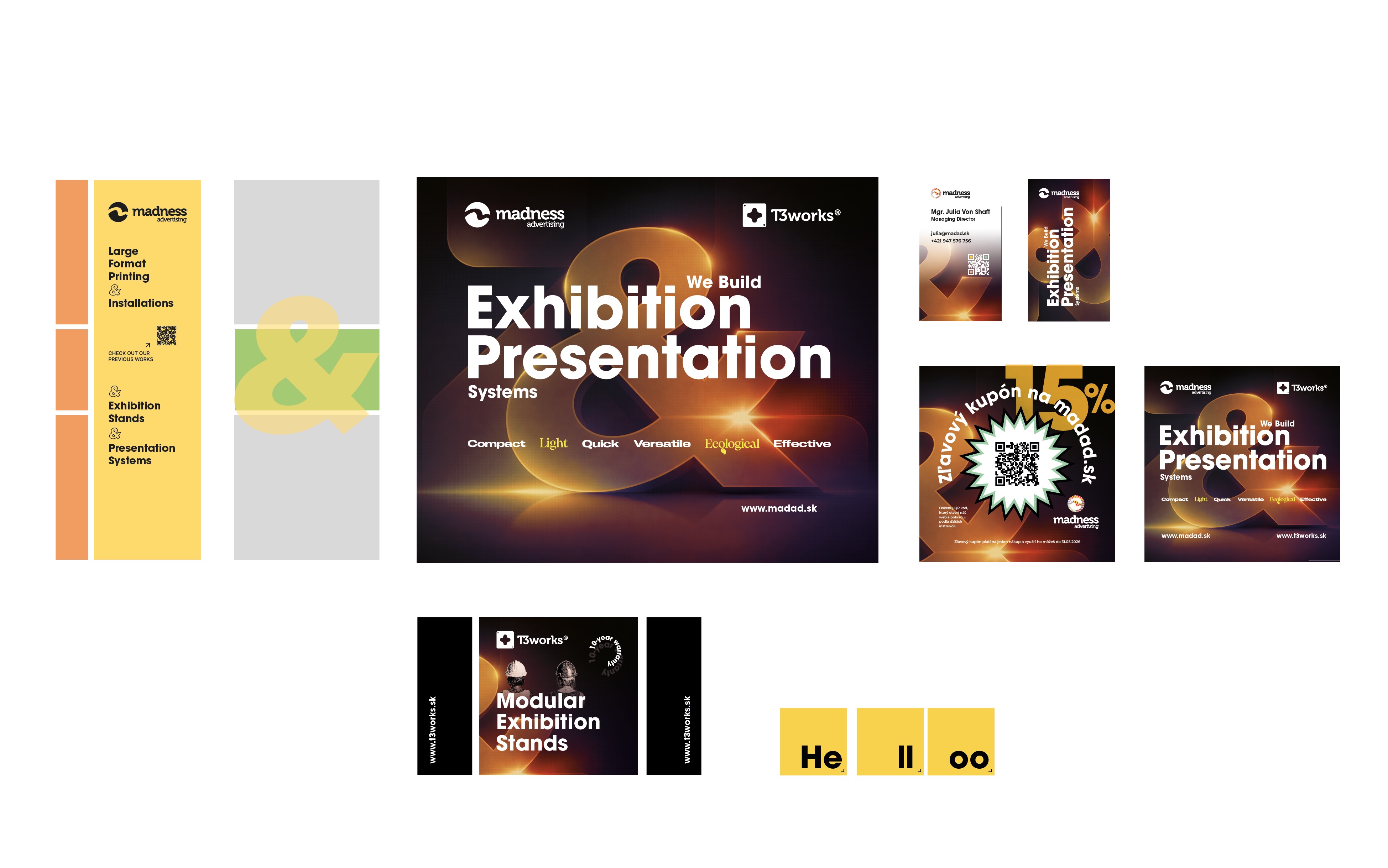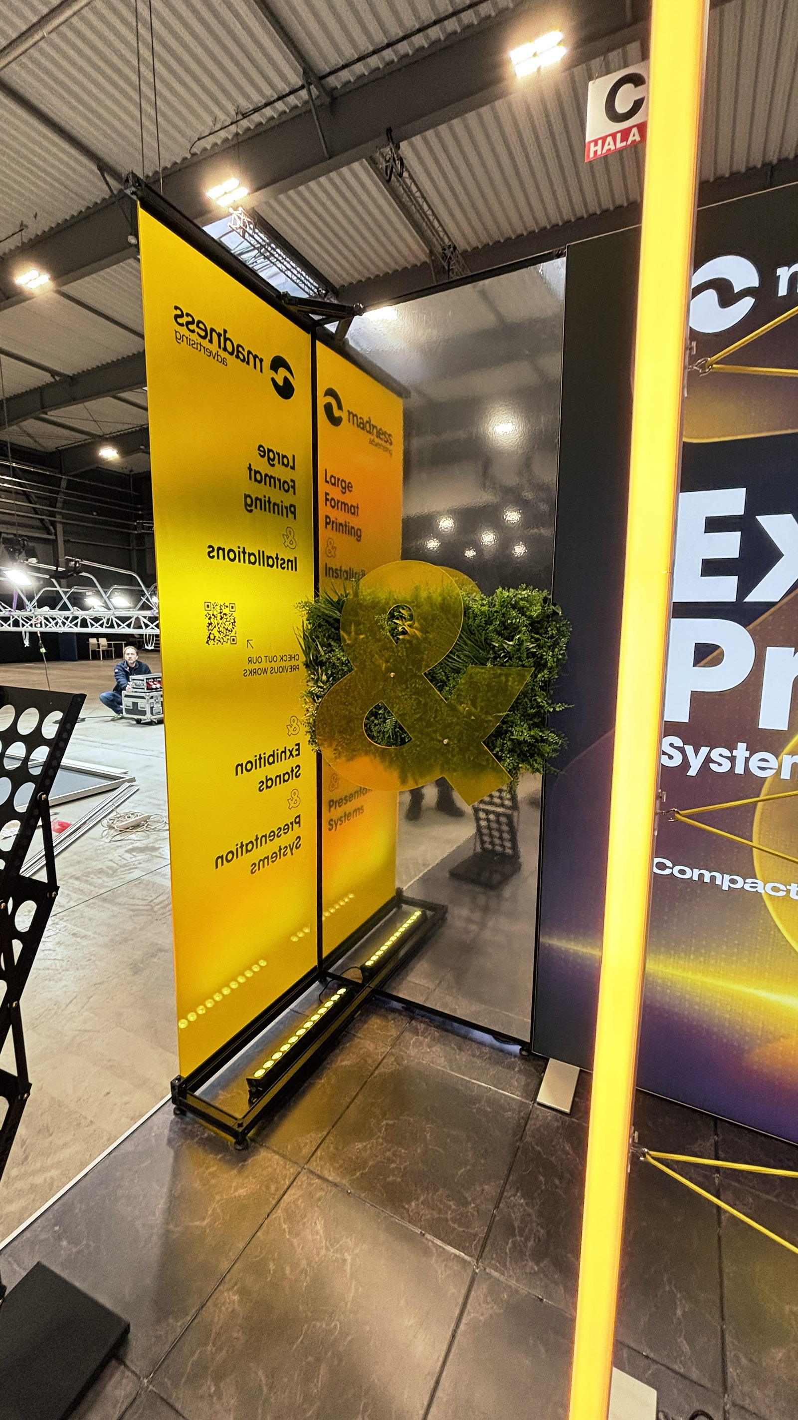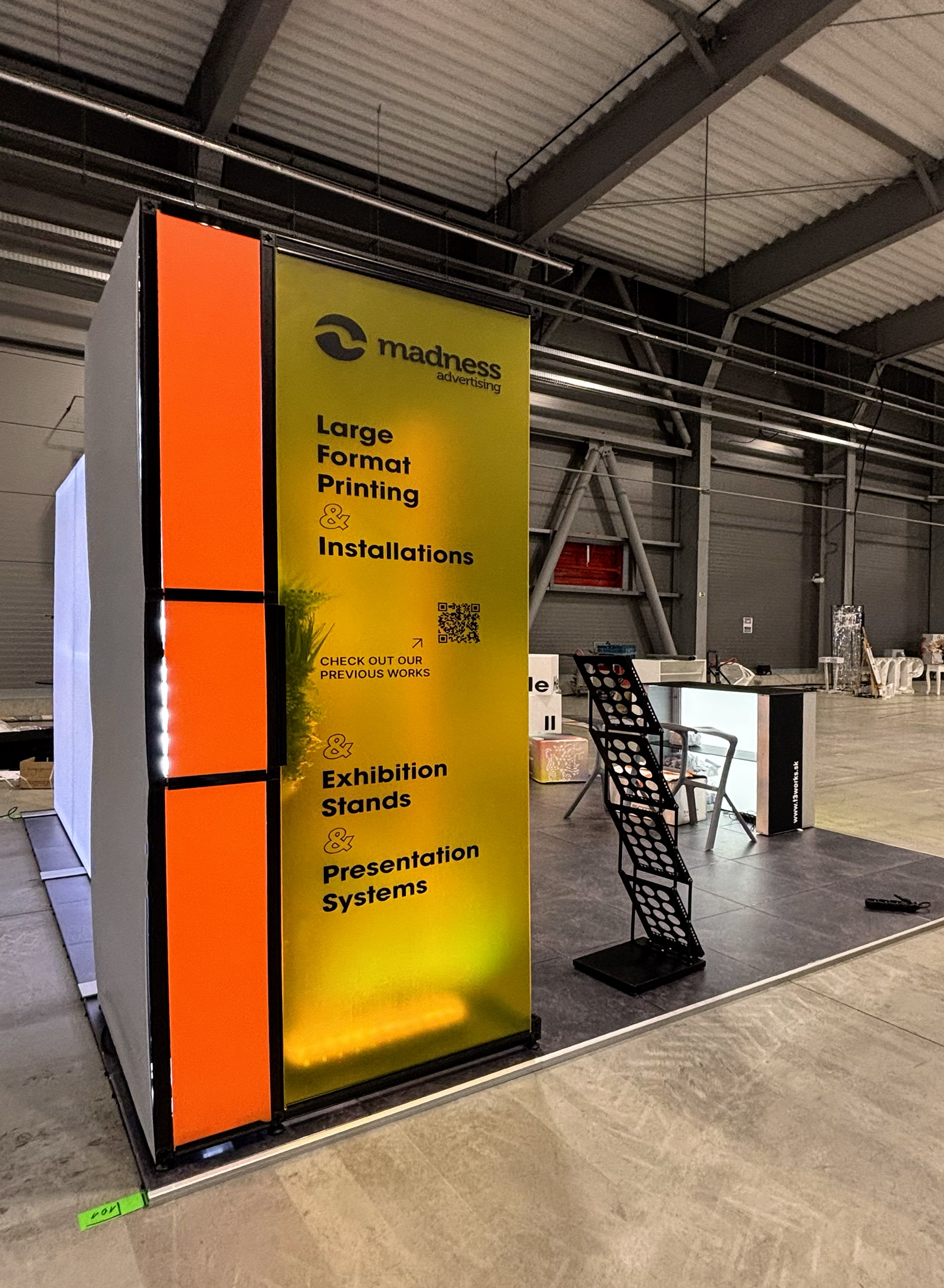 Madness Advertising received a non-typical 4x4 m exhibition space opened from three sides. The stand had to feel light and accessible, but still show a wide range of presentation products in a very small area.