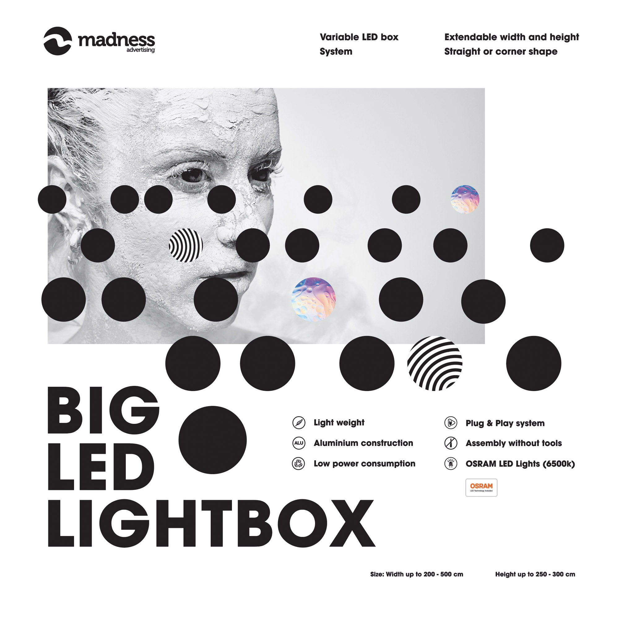 New advertising product from the large-format category required a fresh visual. The wall is backlit with powerful LEDs, which is why we used high-contrast color ratios for maximum impact. The final result is visually strong and effective.
